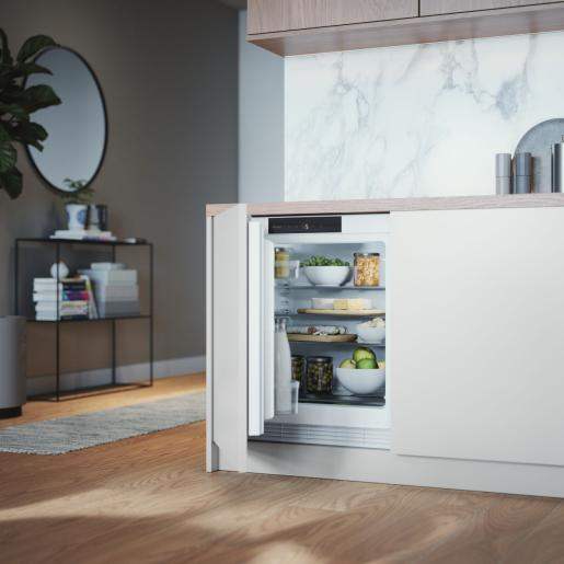 Dieser Kühlschrank ist speziell für den Einbau unter der Arbeitsplatte (Unterbau) entwickelt. Die Be- und Entlüftung erfolgt komplett über den Sockelbereich, sodass keine störenden Lüftungsgitter in der Arbeitsfläche nötig sind. Vier verstellbare Füsse erlauben eine präzise Anpassung an die Höhe Ihrer Arbeitsplatte (bis 90 cm Nischenhöhe).