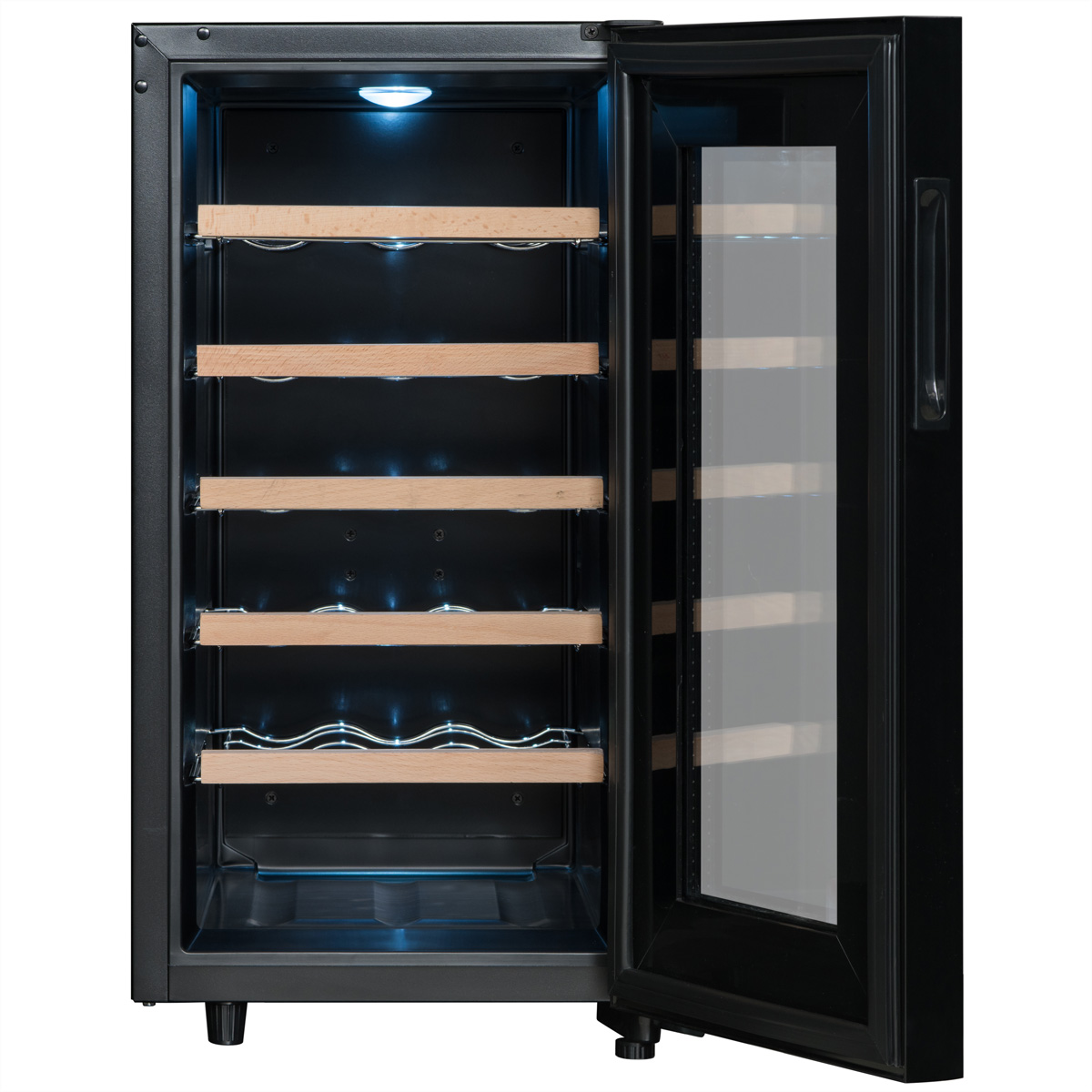 Die weisse LED-Beleuchtung und der in die Türkante integrierte Griff unterstreichen die Ästhetik des CC18F-Kellers noch weiter. Die Beleuchtung ist mit einem Schalter ausgestattet, so dass Sie sie auch ausschalten können.