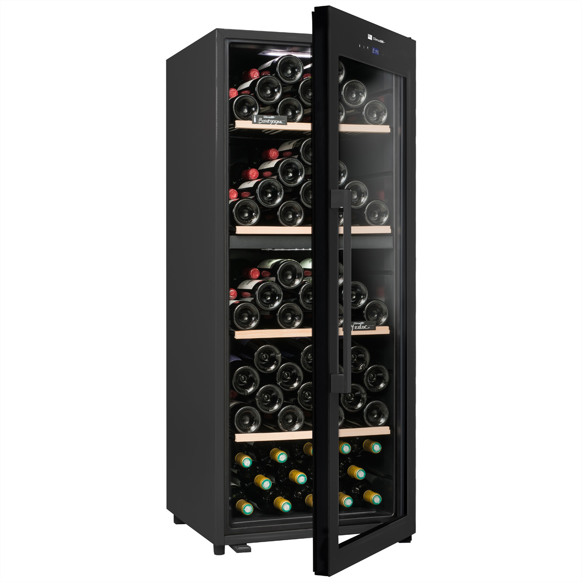 Der Weinkeller CLD115B1 ist eine Neuheit des Jahres 2023 mit einem neuen, eleganten schwarzen Design: Als Zwei-Zonen-Weinkeller bietet er den unbestreitbaren Vorteil, zwei Weinsorten mit unterschiedlichen Temperaturen in einem einzigen Gerät aufbewahren zu können.