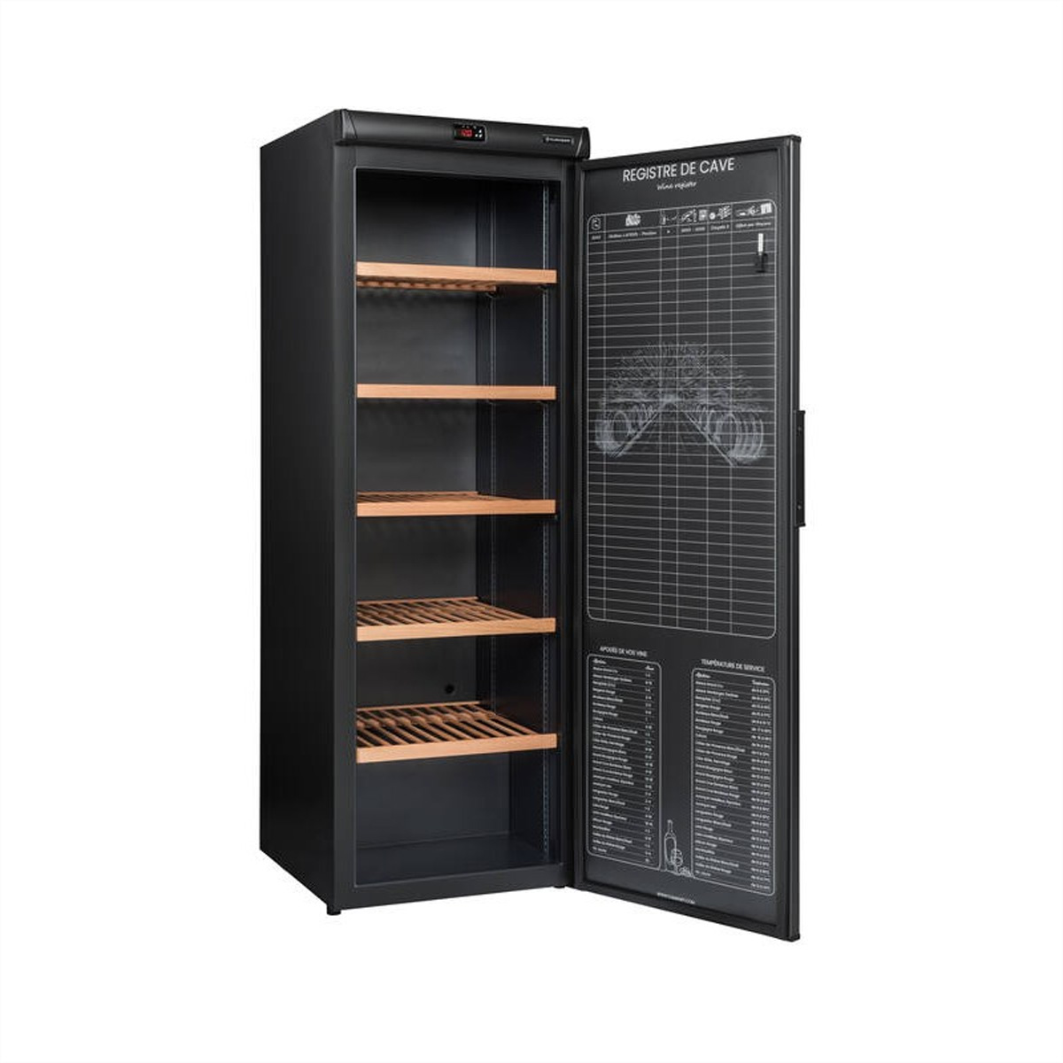 Zusätzliche Sicherheitsfunktionen wie Anti-Vibrationssystem, regulierte Luftfeuchtigkeit und eine bedruckte Innentür zur besseren Organisation machen ihn zur idealen Wahl für Weinliebhaber.