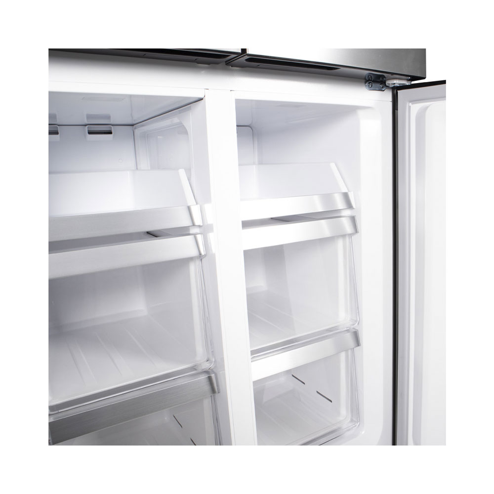 Die Zukunft des Kühlens und Gefrierens - der Kibernetik ECOFC466 Food Center Multi Door. Dieses Food Center bietet ein grosszügiges Fassungsvermögen von 466 Litern. Das wegweisende ECO-Modell ermöglicht es, die Lebensmittel nahtlos in einem einzigen Gerät zu kühlen und zu gefrieren, was nicht nur Platz spart, sondern auch die Energiebilanz verbessert. Die Küche erhält durch die elegante Tür aus hochwertigem Chromstahl nicht nur einen modernen Touch, sondern auch eine hohe Langlebigkeit wird gewährleistet., , Produktinformation, Anzahl Türen: 4, Alarm bei geöffneter Türe, LED-Innenleuchte, In Tür integrierte Digitalanzeige, , Kühlteil, 3x Glastablar, 1x Frischezone (2-8°C) , 1x Anpassbare Zone , 6x Türfach, , Gefrierteil, 2x Tablar ausziehbar, 2x Gefrierschubladen , 2x Anpassbare Gefrierschubladen