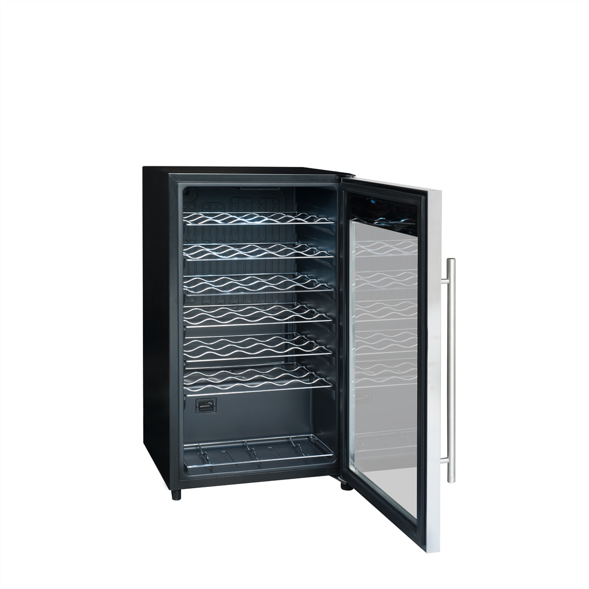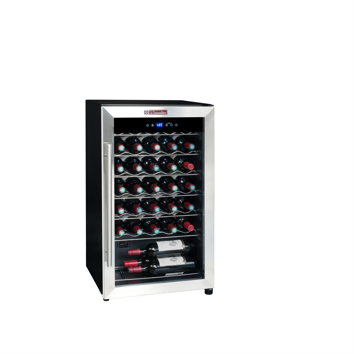 Der Weinservierschrank LS34A bietet eine Lagerkapazität von maximal 34 Flaschen*. Im Einzonenschrank können Sie die Temperatur zwischen 5° und 20°C einstellen. Die Temperatur wird über die Touch-Bedienung vorne an der Tür eingestellt, ohne die Tür zu öffnen. Der formschöne Schrank wird mit 6 Ablagerosten aus Metalldraht sowie einem halben Rost für den unteren Teil des Schranks geliefert. Der Weinschrank ist ein umweltverträgliches Produkt und hat die Energieeffizienzklasse A, ein Zeichen für geringen Stromverbrauch.