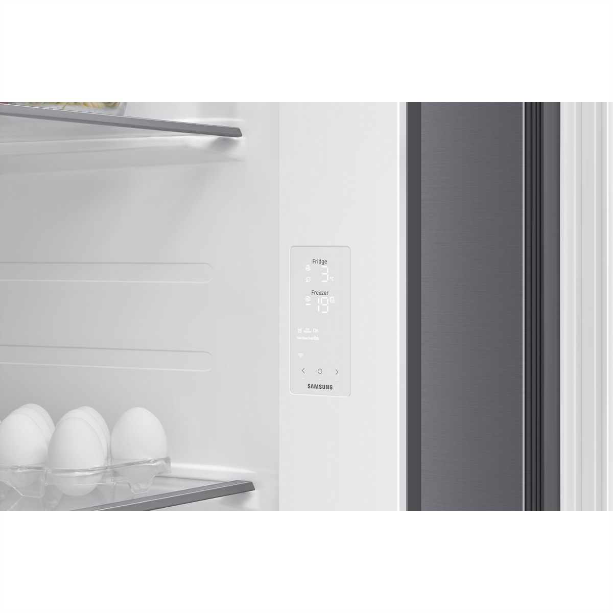 Dank der Funktion «Auto Open Door» ist der Zugriff auf deinen Kühlschrank mühelos. Mit den Touch-Sensoren auf beiden Seiten brauchst du die Tür nur leicht zu berühren und schon öffnet sie sich. Die Sensoren sind immer aktiviert, sodass sie auch im Dunkeln leicht zu finden sind, und ein leises akustisches Signal weist dich darauf hin, wenn sich die Tür öffnet. Durch das innovative Design hast du leichten Zugriff auf die Zutaten; gleichzeitig sorgt das griff- und nahtlose Design für ein elegantes Erscheinungsbild.