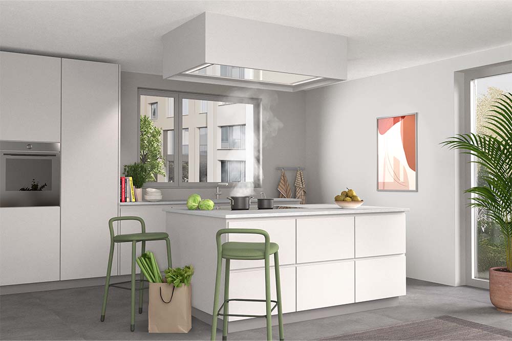 Leistungsstarke Deckenhaube mit integrierter Beleuchtung für Kochinseln oder Integration in einen Oberschrank.